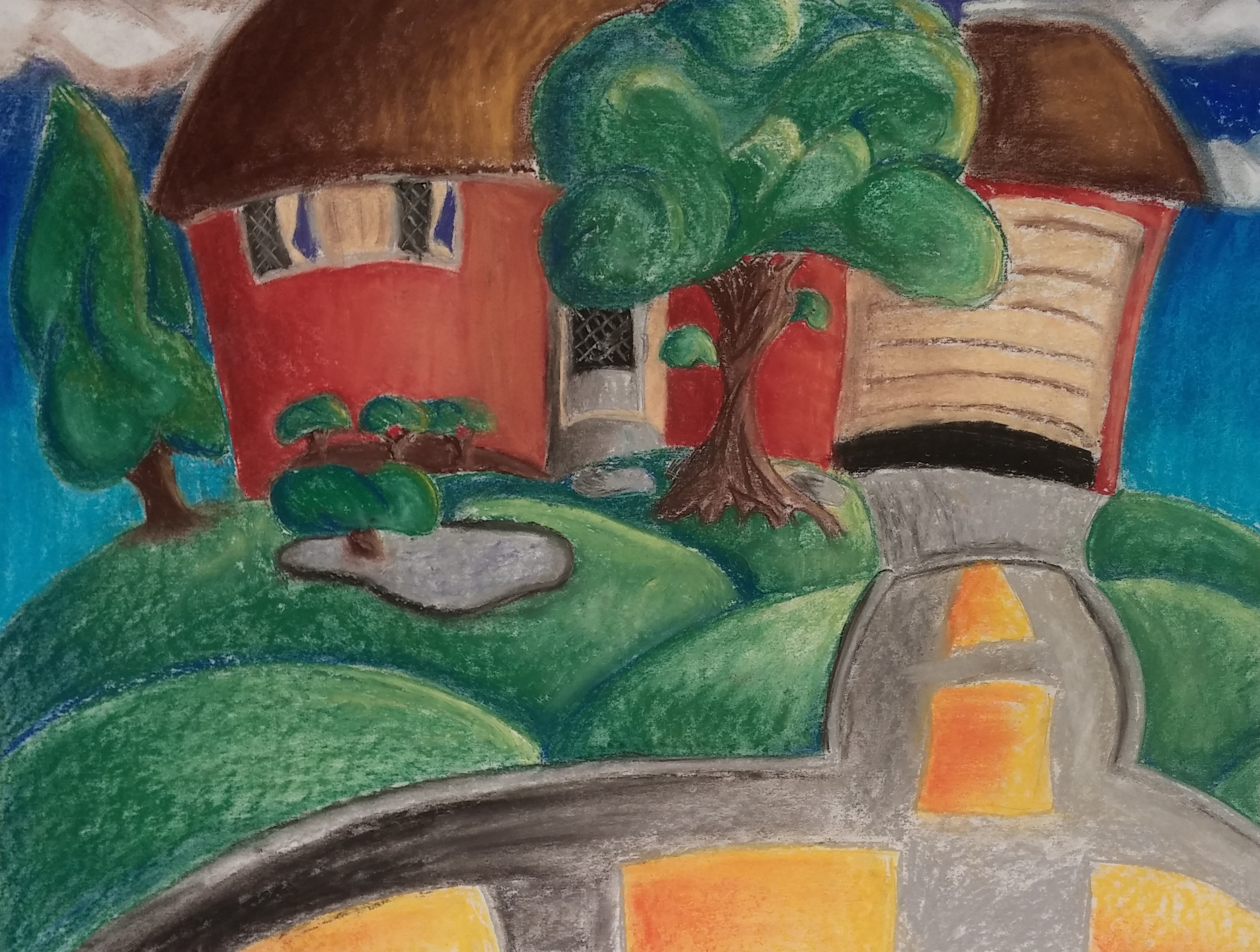 The 2013 – 14 Drawing Class from Waterford Union High School has been working on COMMUNITY as their final major artwork for the 2013-14 school year. Beginning with a self-exploration behind the American Regionalists (1930 – 1935 Midwestern Art Movement) the students chose an artist to research and base their own work on. From the research, the artists took two days to explore the downtown area of Waterford as well as one of the neighboring subdivisions and made preliminary drawings as well as photographs.Once back in the studio, the artists got to work creating their vision of what community was to them and how they fit into that space. Just like the American Regionalists worked to document and comment on their Midwestern communities, our young artists worked to do the same.