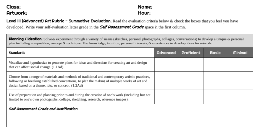 I know that this is a level of excitement that few people will share with me, but, in order to help the artists develop a strong set of self-reflection and self-evaluation skills and to also create a really strong set of artworks – the following rubrics are here for your perusal. Enjoy.