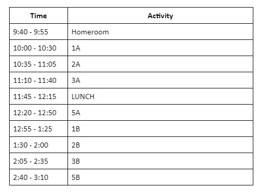 Hello and welcome back. We will be getting into the swing of things fast, but let’s take it slow in the beginning. Here is the schedule for today!